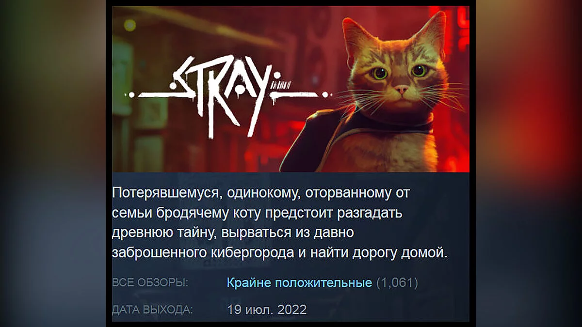 На ПК и консолях PlayStation состоялся релиз киберпанк-адвенчуры про котика Stray, одной из самых ожидаемых игр 2022 года. Как и предполагалось, геймеры оказались в восторге от новинки. Проект получил 97% рейтинга в Steam.