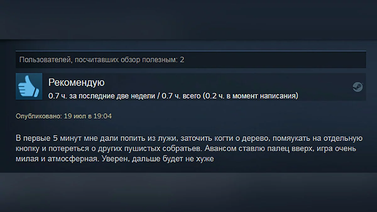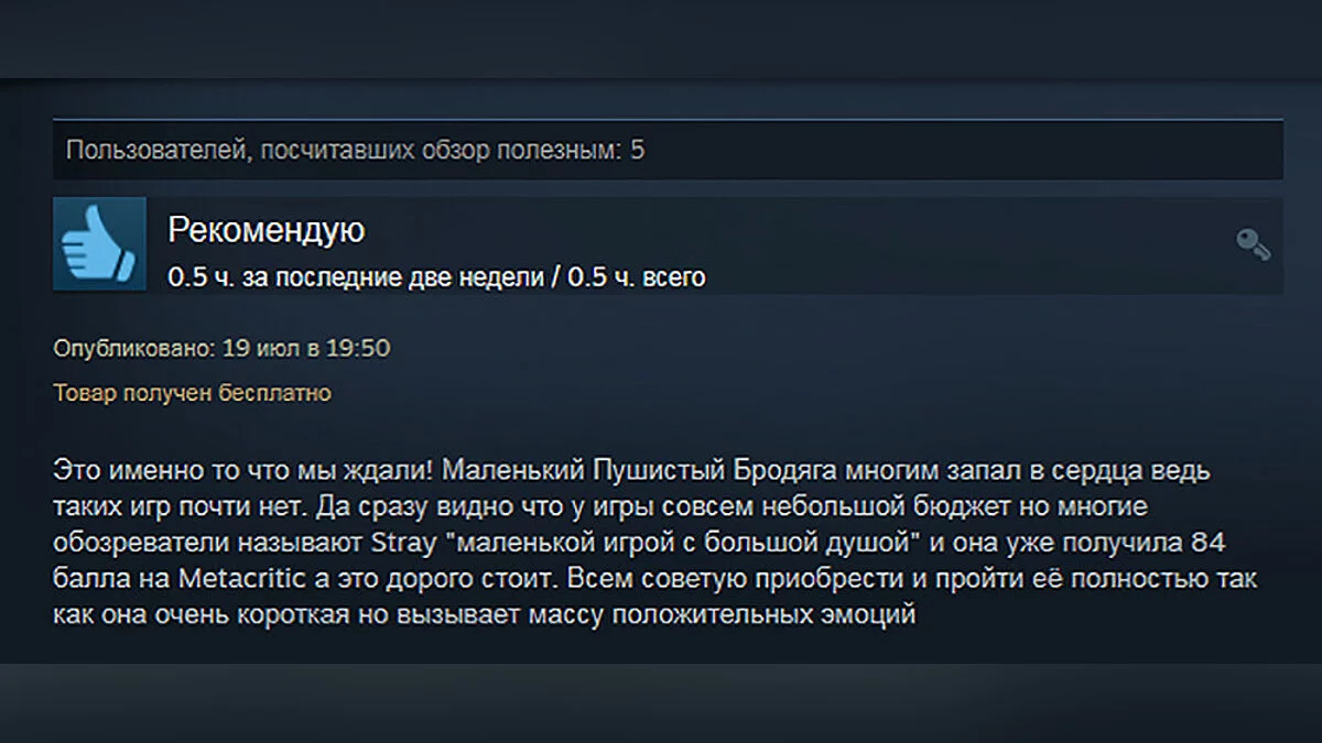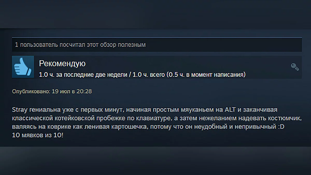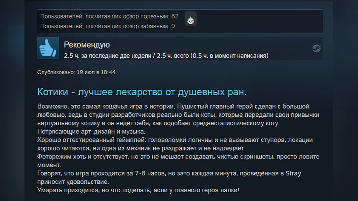 Stray хвалят за потрясающие арт-дизайн, приятную музыку, стильный интерфейс, интуитивно понятные головоломки, крутую проработку локаций, отсутствие раздражающих механик и не только. Особенно геймеров порадовал пушистый главный герой — разработчикам удалось сделать его максимально реалистичным. По словам игроков, адвенчура оказалась короткой, но каждая её минута приносит удовольствие и дарит массу положительных эмоций.