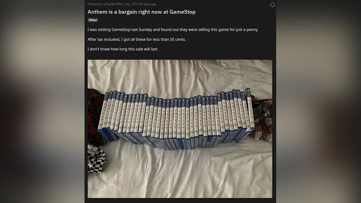 Благодаря щедрой акции некоторые игроки закупились сразу несколькими дисками. К примеру, реддитор Spider-Man_Fan купил 37 копий Anthem за 41 цент с учетом налогов.