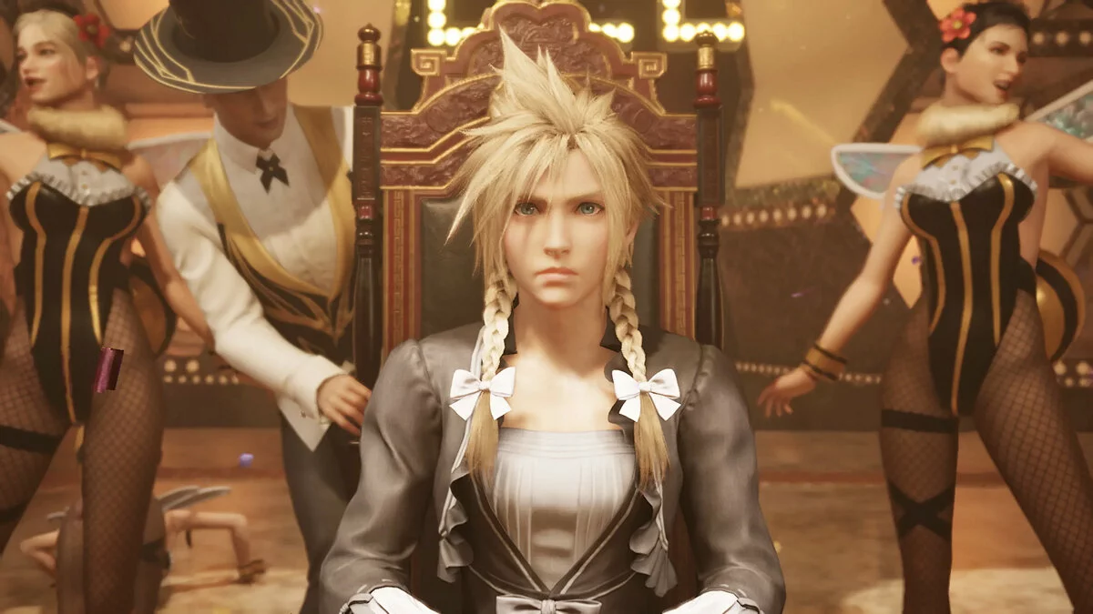 Возможно, стоит дать небольшое пояснение для тех, кто незнаком с седьмой частью. И в ремейке, и в оригинальной игре есть эпизод, в котором Клауду приходится притвориться женщиной, чтобы попасть в ночной клуб. Примечательно, что разработчики придумали три разных наряда — герой наденет один из них в зависимости от того, сколько побочных квестов выполнил игрок.