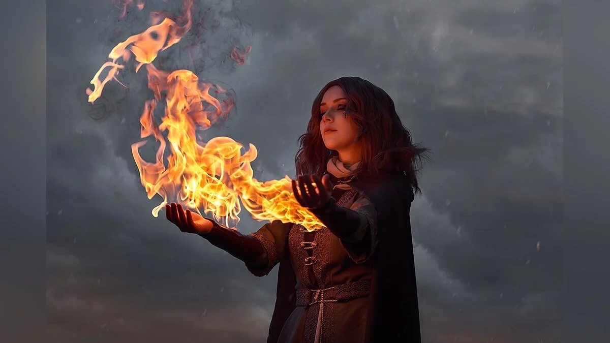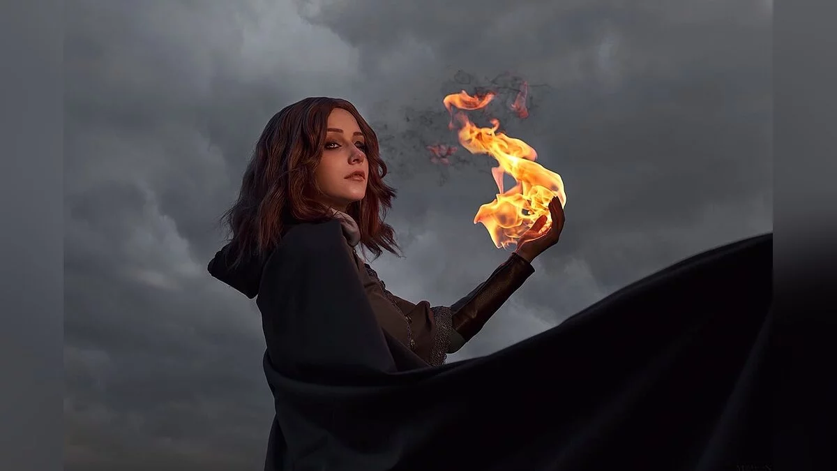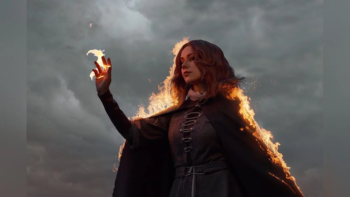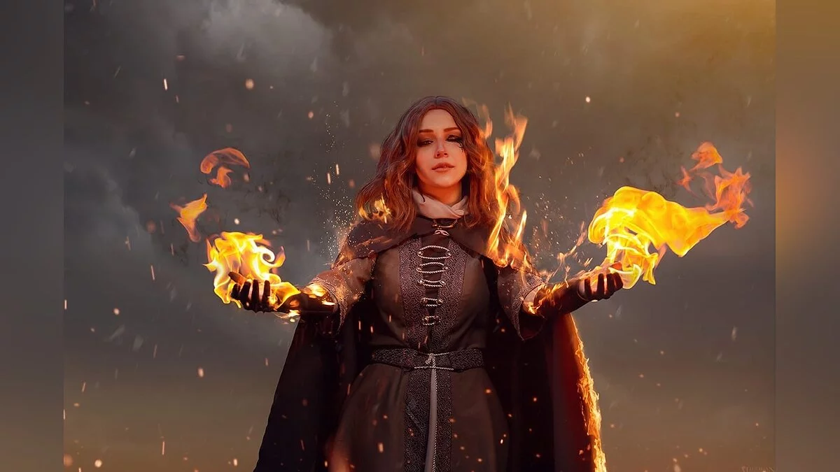 Девушка с 10-летним опытом в косплее показала себя в образе Мелины из Elden Ring. На фото она вся в огне
