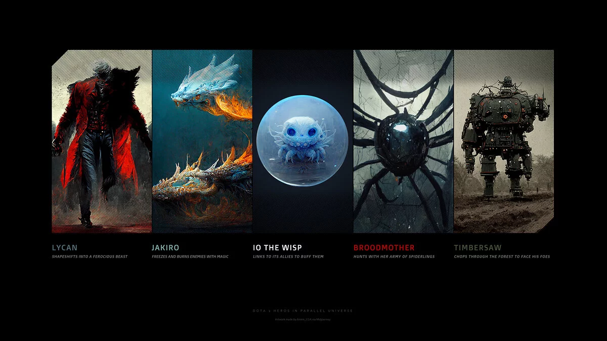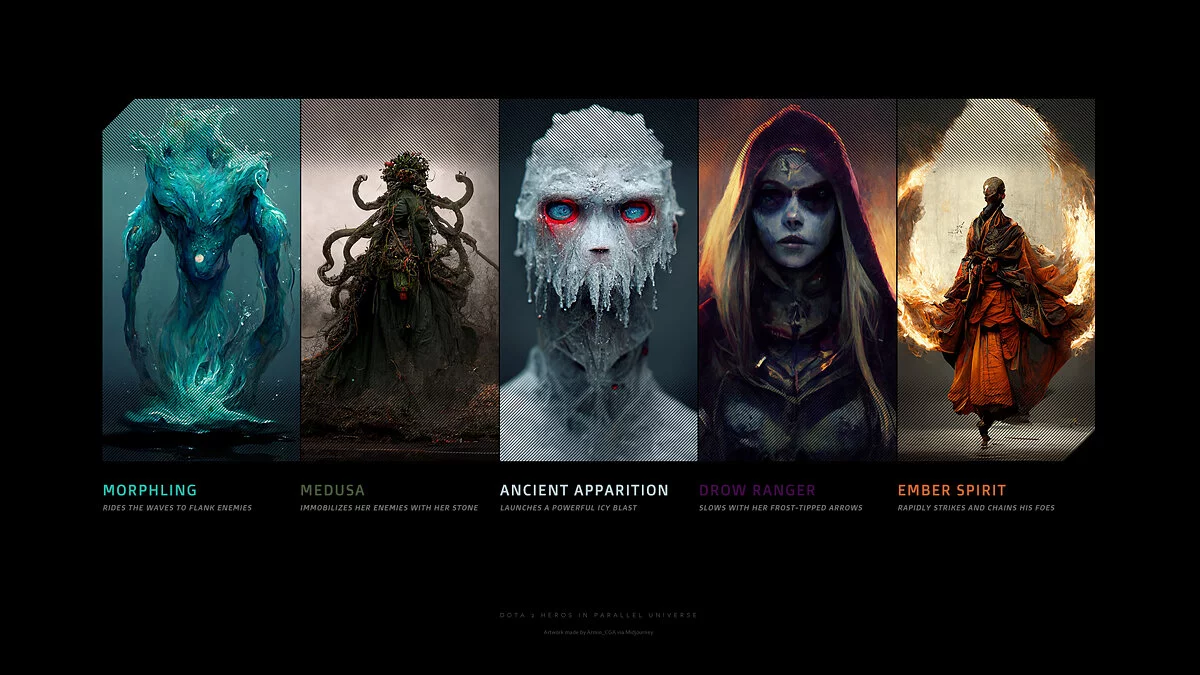 Пользователь Reddit с ником Ill_Pipe_2069 опубликовал на форуме изображения, показывающие, какими героев Dota 2 видит нейросеть Midjourney. Работы получились гораздо мрачнее, нежели оригинальные дизайны персонажей из игры.
