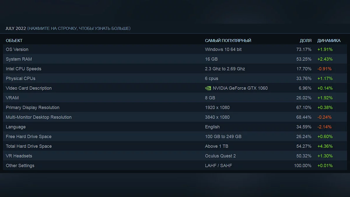 Большинство пользователей Steam используют 8 ГБ видеопамяти (26.02%), 16 ГБ ОЗУ (53.25%), 6-ядерный процессор (33.76%) и монитор с разрешением 1920x1080 (67.10%). Наиболее популярным VR-шлемом оказался Oculus Quest 2 (50.32%).