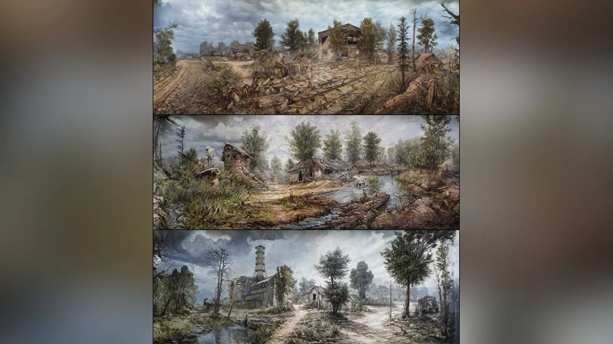 На третьем и четвёртом рисунках показаны Лесничество на Затоне, место, очень напоминающее локацию «Болота», и довольно странная версия Припяти.