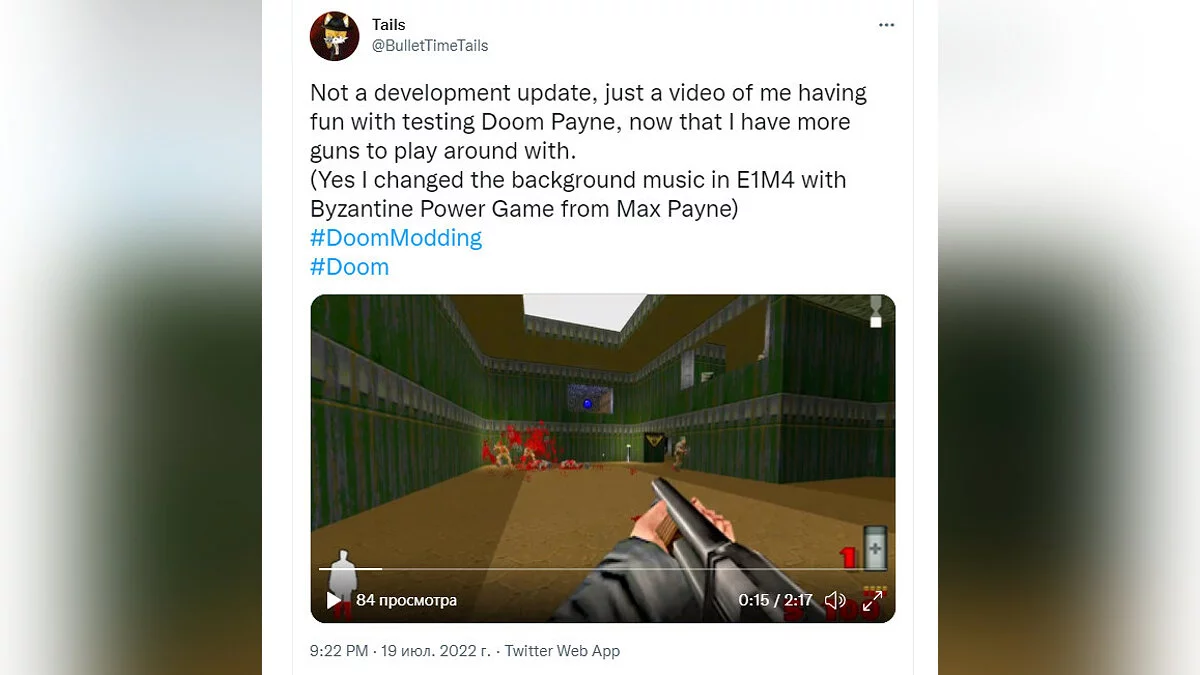Энтузиасты создают всё более безумные сочетания популярных игр. Так, моддер под ником BulletTimeTails сообщил, что работает над проектом DOOM Payne, который, как понятно из названия, объединяет классическую версию DOOM с механиками Max Payne.