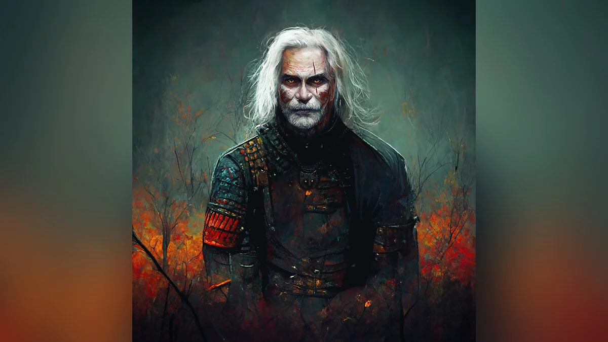 В новой работе снова использовалась нейросеть MidJourney, генерирующая картинки по описанию. Искусственный интеллект хорошо справился с девушками — изображения похожи на нарисованные красками картины. А вот ведьмак получился чуть хуже. Нейросеть слишком состарила героя.