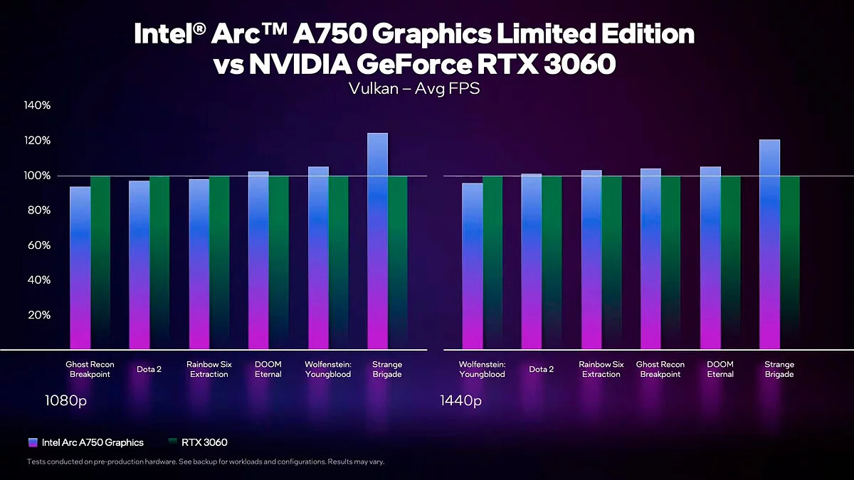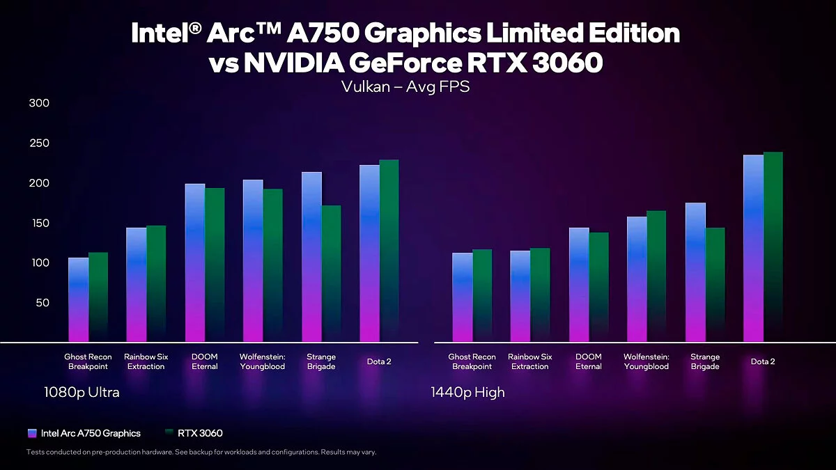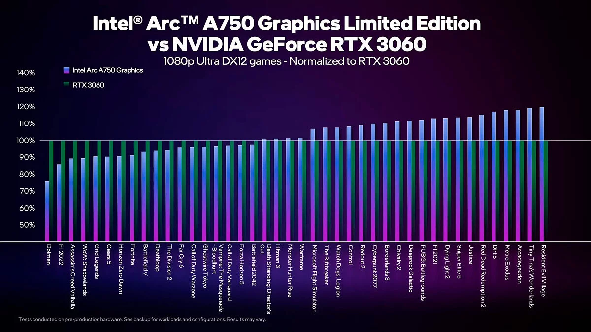 Компания Intel опубликовала результаты тестирования своей почти флагманской видеокарты Arc A750 Limited Edition в играх. Все они основаны на графических API DirectX 12 и Vulkan, а тесты проводились в разрешении 1080p с максимальным качеством графики и в 1440p с высоким качеством. Противником стала NVIDIA GeForce RTX 3060 XC Gaming от EVGA.