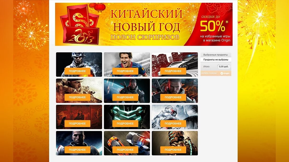 В преддверии Китайского Нового года компания Electronic Arts начала новую распродажу в своем фирменном магазине цифровой дистрибуции Origin. Лучшие хиты последних лет можно приобрести со скидкой от 30 % до 50 %.