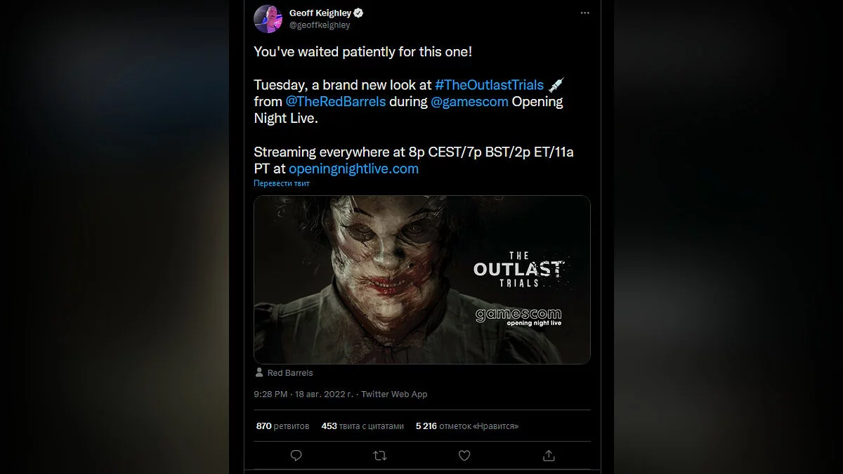 Ведущий gamescom 2022 Джефф Кейли (Geoff Keighley) сообщил в Twitter, что на церемонии открытия мероприятия покажут кооперативный хоррор The Outlast Trials. В игре речь пойдёт о технологиях «промывания мозгов» и контроля сознания.