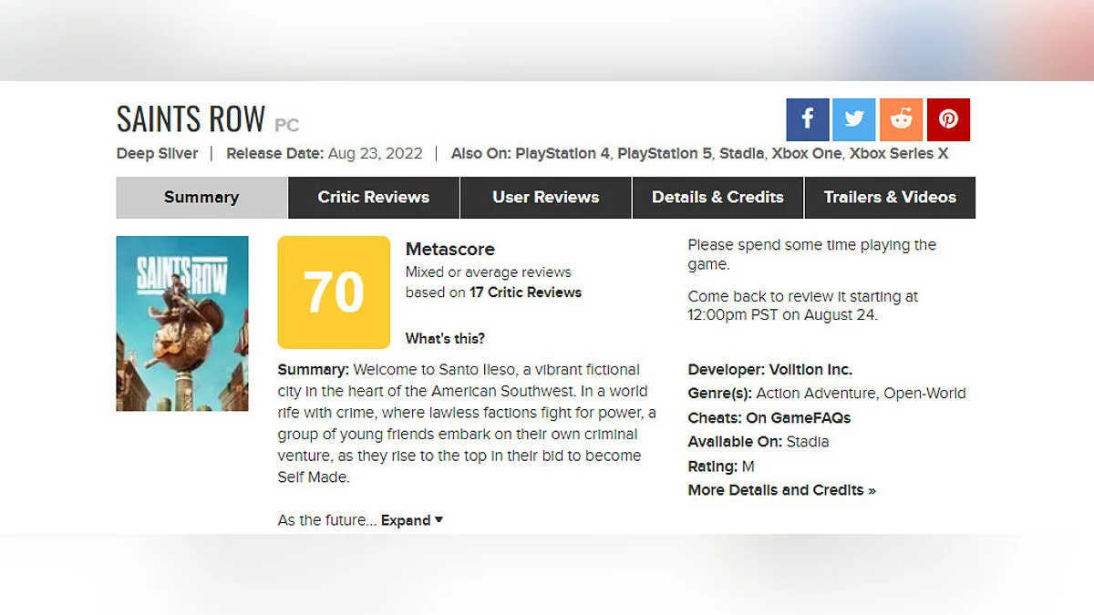 Игра вышла сегодня, 23 августа, но получила холодный приём. На Metacritic PC-версию игры оценили в 70 баллов, это практически самый низкий показатель в серии, хуже ситуация только у Agents of Mayhem и Gat Out of Hell. А профильные СМИ дали игре максимум 8.5 балла.