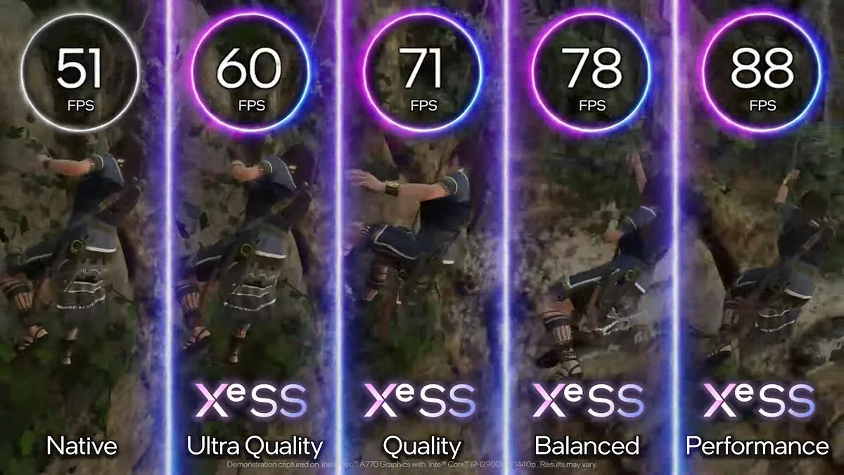 «Синие» показали работу системы на карте Arc A770, которую пока даже не представили. На PC с этой картой запустили Shadow of The Tomb Raider в разрешении 1440p с включённой трассировкой лучей. В результате без XeSS карта выдавала порядка 51 FPS, а с ней — от 60 до 88 FPS в зависимости от настроек качества.