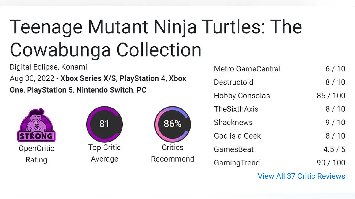 За день до выхода появились оценки. The Cowabunga Collection получил 81/100 баллов на OpenCritic. Из плюсов критики выделили большое количество игр и геймплейные улучшения, из минусов — редкие подтормаживания на ПК.