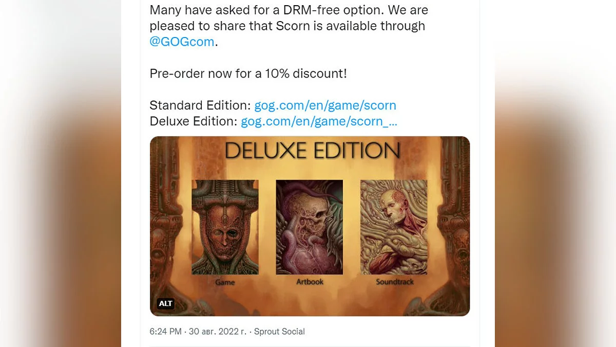 Студия Ebb Software сообщила, что выпустит свой «биомеханический» экшен-хоррор от первого лица Scorn на PC не только в Steam, но и в GOG. Таким образом, в игре не будет дополнительной защиты от пиратов.