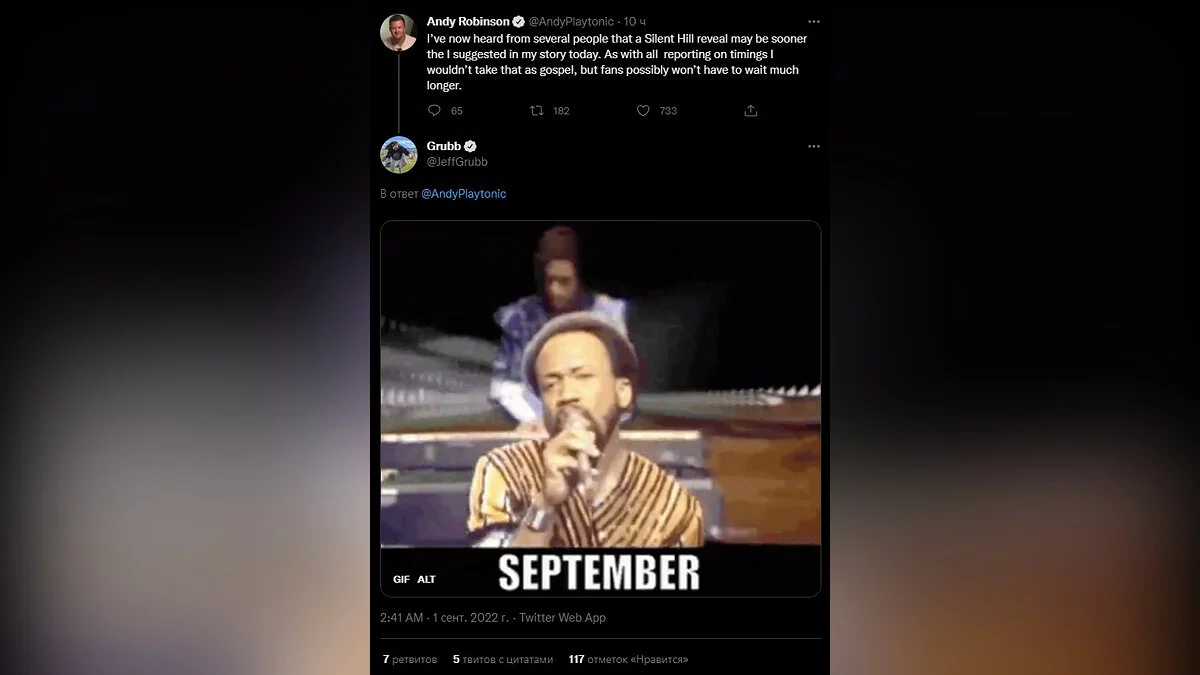 Похоже, скоро история с ожиданием новой Silent Hill закончится. Журналист VGC Энди Робинсон (Andy Robinson) услышал от нескольких людей, что анонс случится раньше, чем предполагалось. Джефф Грабб (Jeff Grubb), еще один известный инсайдер, прикрепил к посту Робинсона гифку с надписью «Сентябрь».
