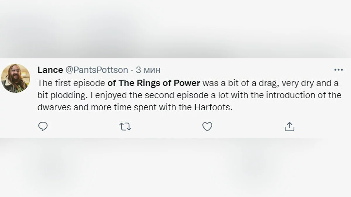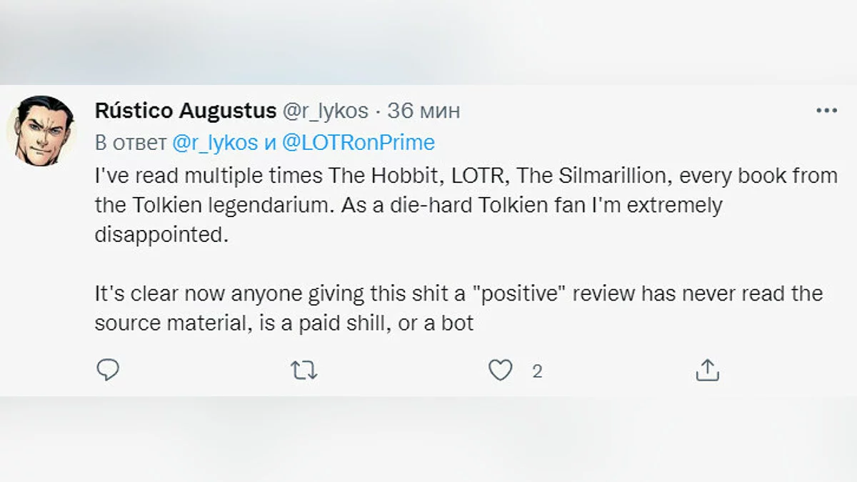 «Я несколько раз читал “Хоббита”, “Властелина колец”, “Сильмариллион”, все книги из легендариума Толкина. Как преданный фанат, я крайне разочарован. Теперь ясно, что любой, кто дает этому де***ьму “положительный” отзыв, никогда не читал исходный материал, является проплаченной подсадной уткой или ботом».