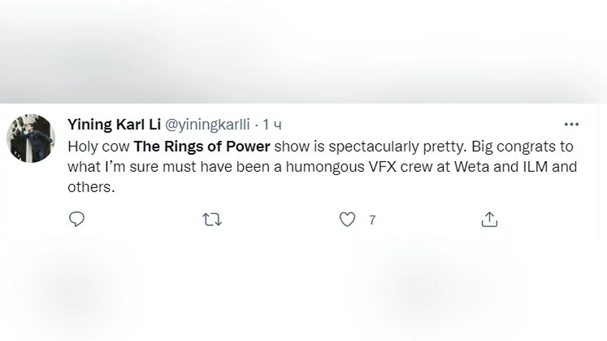«“Властелин колец: Кольца власти” потрясающе красивый. Большие поздравления, я уверен, команды. занимающиеся спецэффектами (VFX, Weta и ILM) — просто огромные».