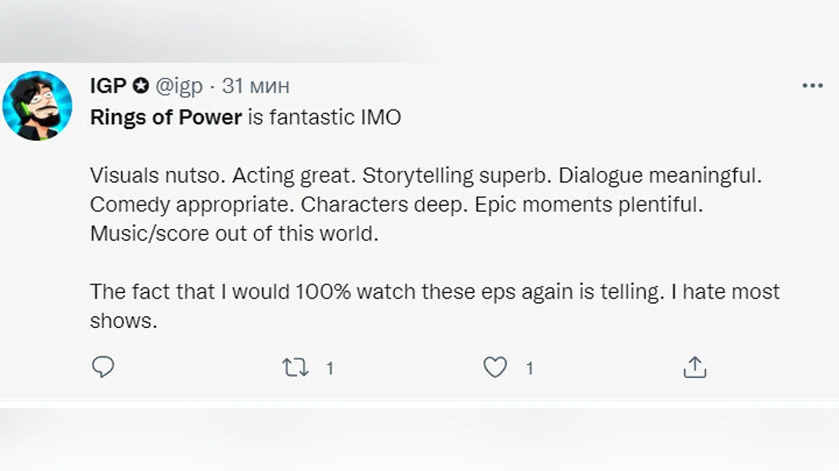 «“Кольца власти” — это фантастика. Безумный визуал. Потрясающая игра актеров. Великолепная история. Диалоги со смыслом. Уместные комедийные моменты. Глубокие персонажи. Полно эпических моментов. Музыка не из этого мира. Тот факт, что я на 100% посмотрел бы эти эпизоды снова, говорит сам за себя. А еще я ненавижу большинство шоу».