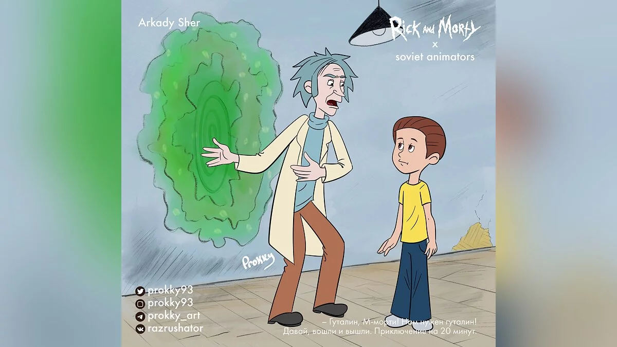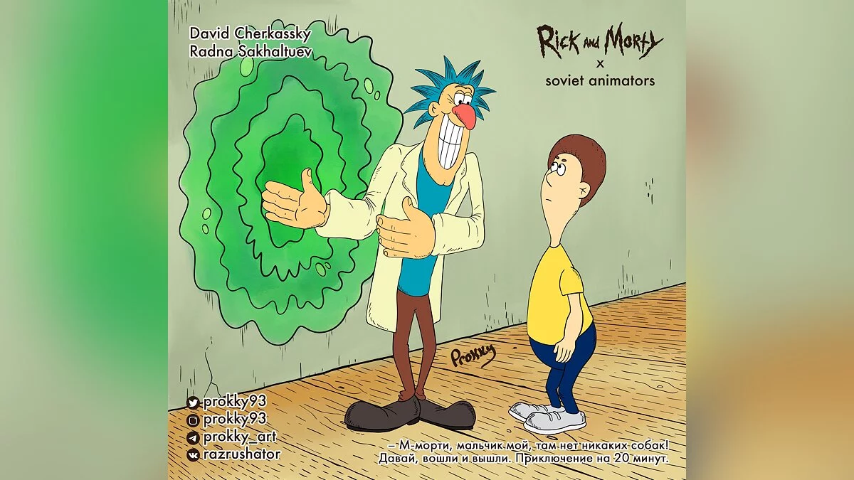 Сегодня состоялась премьера шестого сезона «Рика и Морти». В честь этого Прокопий «Prokky» Уляшов из «Союзмультфильма» пофантазировал, как бы выглядели главные герои, если бы их рисовали советские мультипликаторы. За основу автор взял меметичную сцену «Вошли и вышли, приключение на 20 минут».