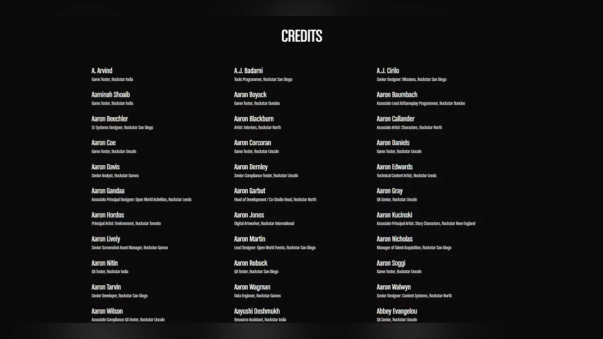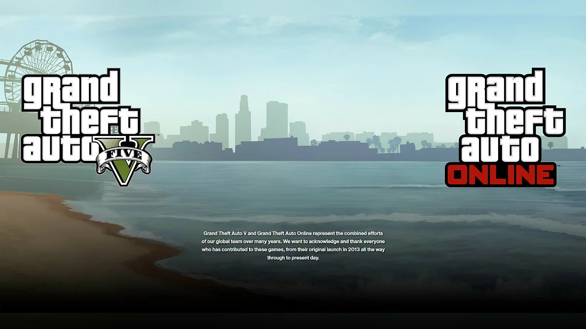 Grand Theft Auto 5 и Grand Theft Auto Online — это результат совместных усилий нашей глобальной команды на протяжении многих лет. Мы хотим выразить признательность и поблагодарить всех, кто внес свой вклад в эти игры, начиная с первоначального запуска в 2013 году и заканчивая сегодняшним днем.