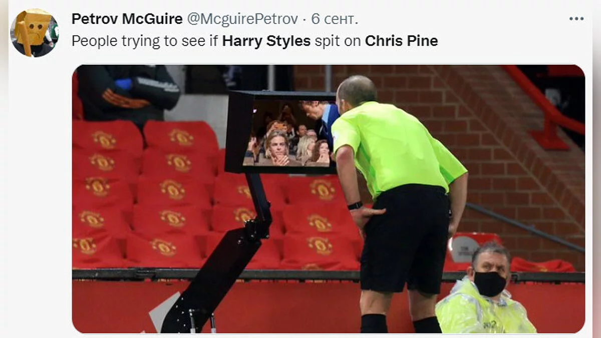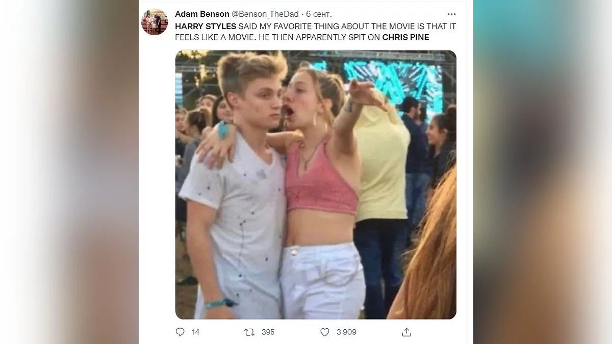 На днях в сети появился новый интернет-мем, который связан с актером Крисом Пайном (Chris Pine) и музыкантом Гарри Стайлзом (Harry Styles). Фанаты убеждены, что на 79-м Венецианском кинофестивале во время премьеры «Не волнуйся, солнышко» певец плюнул в звезду «Звездного пути».