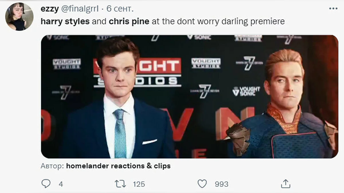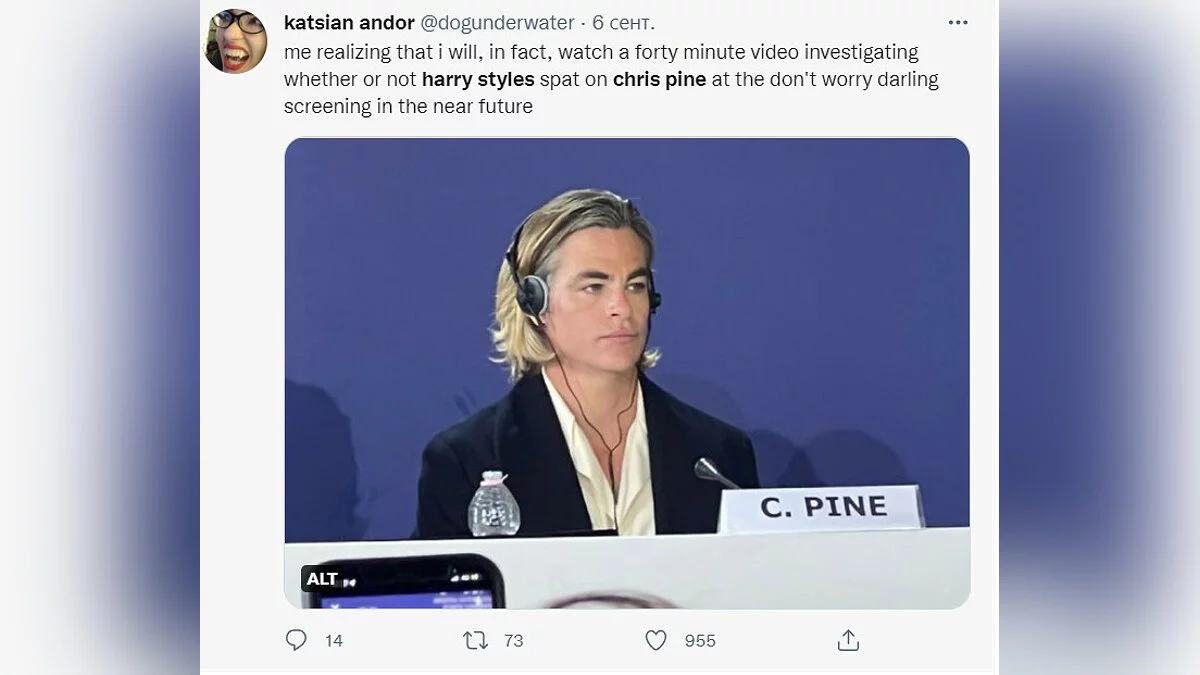 «Я, понимая что посмотрю сорокаминутное видео, в котором выясняется, плюнул ли Гарри Стайлз на Криса Пайна на премьере “Не волнуйся, солнышко” в ближайшем будущем».