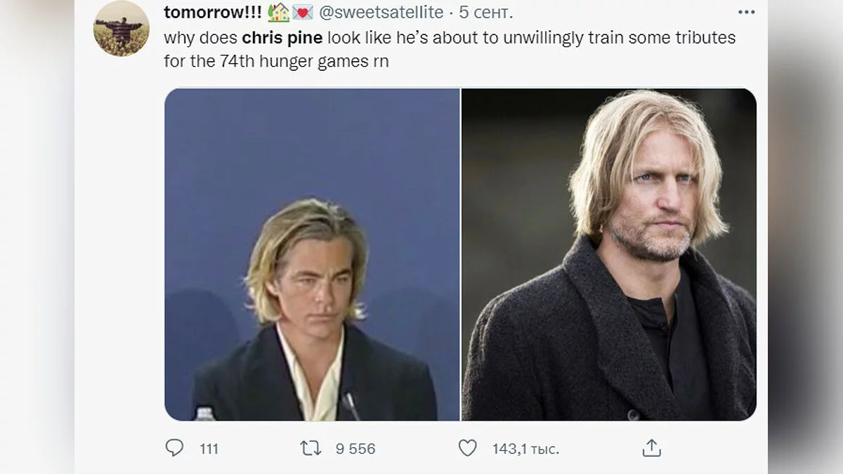 «Почему Крис Пайн выглядит так, будто он неохотно собирается тренировать трибуты для 74-х Голодных игр?».