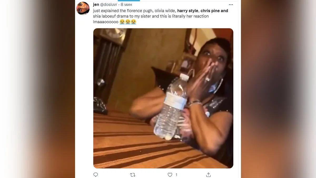 «Только что рассказала своей сестре о драме c Флоренс Пью, Оливией Уайлд, Гарри Стайлзом, Крисом Пайном и Шайей Лабафом, и это буквально ее реакция