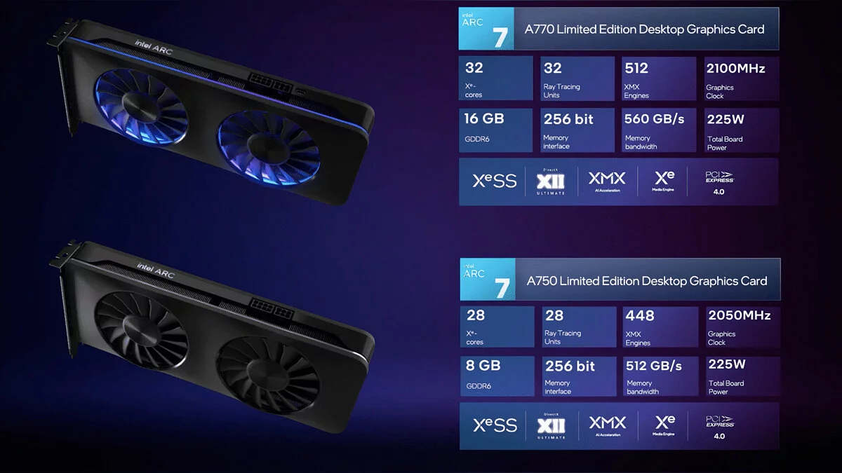 Все три карты построены на графическом чипе ACM-G10. Старшая модель располагает 32 ядрами Xe и имеет 4096 ядер FP2. GPU работает на частоте 2,1 ГГц. Для неё обещаны версии на 8 и 16 ГБ памяти с частотой 17,5 ГГц, а ширина шины данных — 256 разрядов. Конкурентом A770 выступит NVIDIA GeForce RTX 3060 Ti.