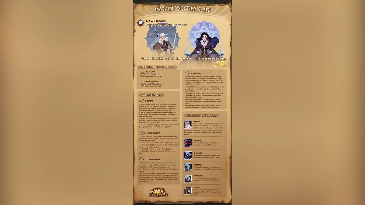 Оба героя появятся в AFK Arena с выходом обновления 1.98, которое станет доступно уже 13 сентября. Также патч введёт в игру союз героев «Настоящее приключение», систему «Звери», приключение «Искусство завоевания» в Воздушный шар путешественника, запустит новый сезон Временного разлома, изменит характеристик некоторых героев и не только.