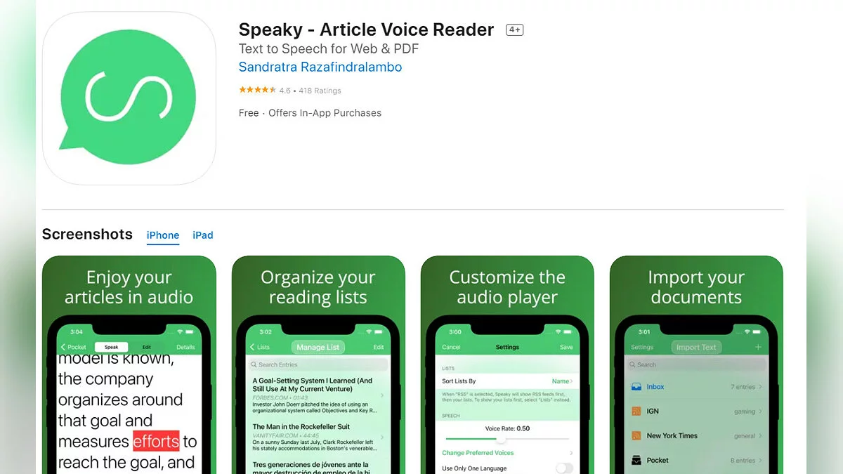 - Speaky — Article Voice Reader — программа, позволяющая зачитывать текст в режиме реального времени (загрузить бесплатно).