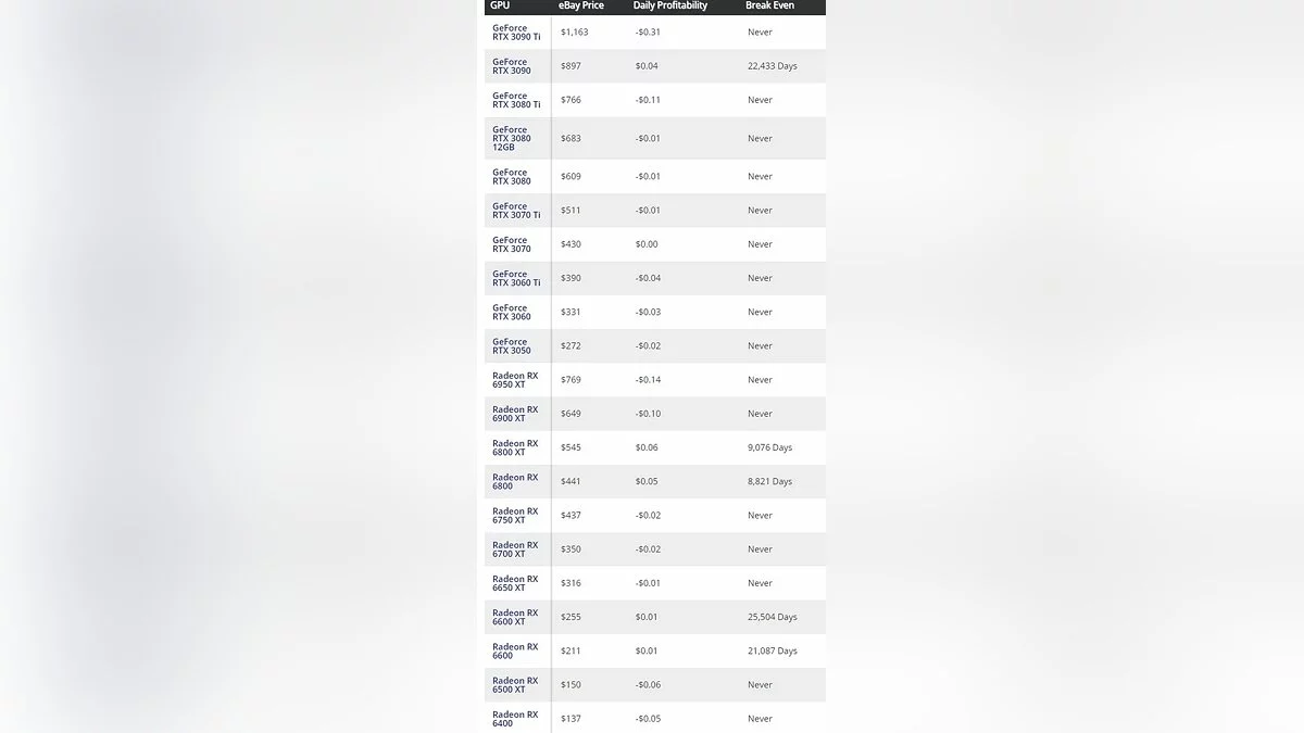 Важно отметить, что уже имеющиеся единицы криптовалюты почти не изменились в цене, речь идёт именно о майнинге новых. По данным ресурса Tom's Hardware, теперь добыча их в течение дня приносит от силы 6 центов прибыли. При стоимости в 10 центов за 1 кВ·ч и текущих ценах на ускорители их попросту не получится окупить. Например, для покрытия стоимости одной видеокарты Radeon RX 6800 потребуется более 20 лет.