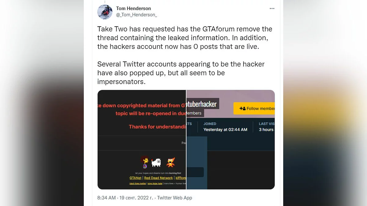 Инсайдер Том Хендерсон (Tom Henderson) рассказал, что компания Take-Two обратилась к GTAforum с просьбой удалить ветку, содержащую утечку информации по GTA 6. Также удалили все сообщения пользователя под ником teapotuberhacker, который и опубликовал утечку.
