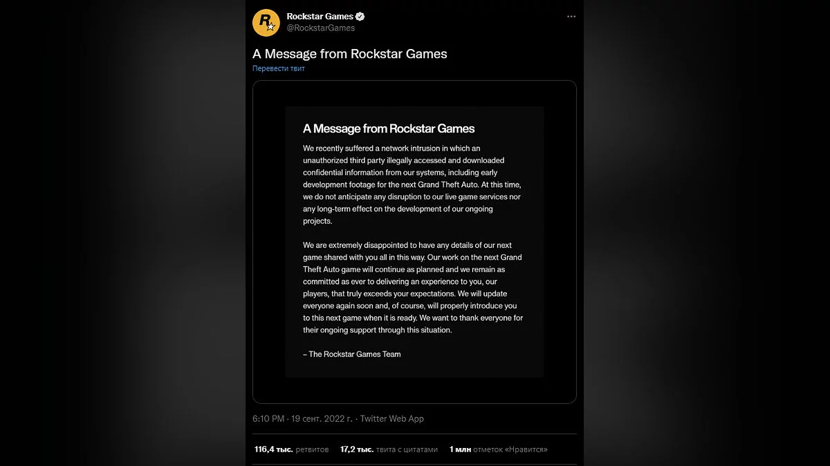 Обращение Rockstar насчет утечки по GTA 6 поставило рекорд в Twitter