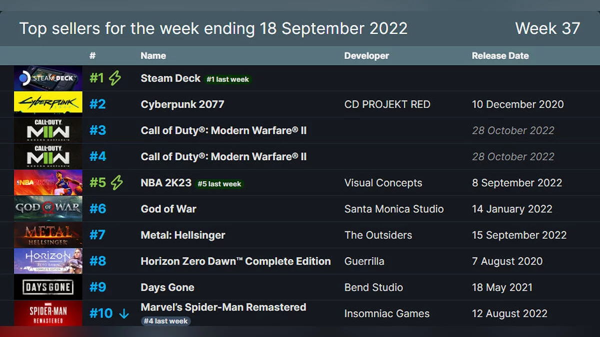 Кроме того, Cyberpunk 2077 заняла второе место в ТОП-10 самых прибыльных проектов в Steam за прошедшую неделю (с 12 по 18 сентября).