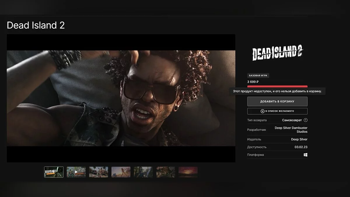 В российском Epic Games Store сняли с продажи Dead Island 2. Теперь на странице красуется надпись, что игра недоступна для данного региона. Тем же, кто предзаказал её ранее, возвращают деньги.