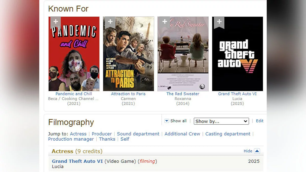 Пользователи сети заметили изменения на IMDb-страничке Александры Эчаварри (Alexandra Echavarri) — это актриса, которая играет Люсию в GTA 6. Теперь на сайте прямо указано, какая роль досталась девушке.