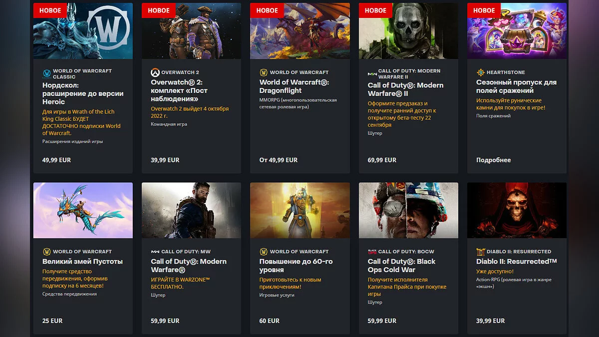 В магазине Battle.net с 23 сентября пропали цены на игры в рублях. Теперь для игроков из России и Беларуси стоимость выводится в евро. Отметим, что в июле там уже появились цены в евро, однако они касались только новых игр, а старые можно было купить за рубли.