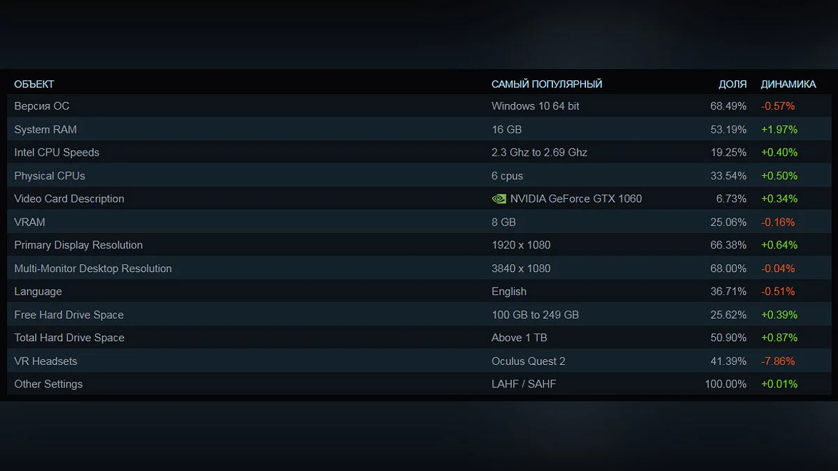 Количество геймеров с Windows 10 (64-бит) снова уменьшилось. На этот раз на 0.57%. Игроков с видеокартой GTX 1060, наоборот, стало больше — на 0.34%.