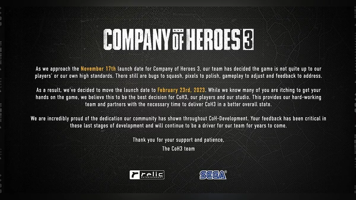 Разработчики Company of Heroes 3 поделились не самыми приятными новостями. Игру решили перенести: теперь она выйдет не 17 ноября 2022-го, а 23 февраля 2023-го.