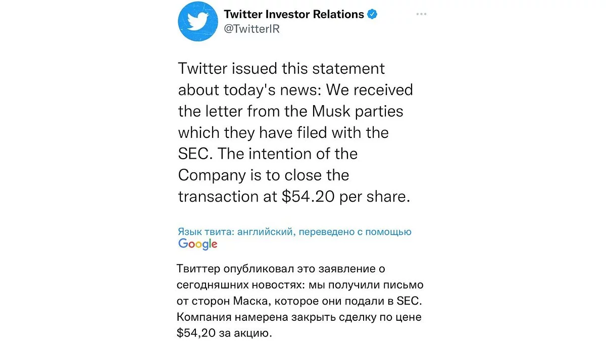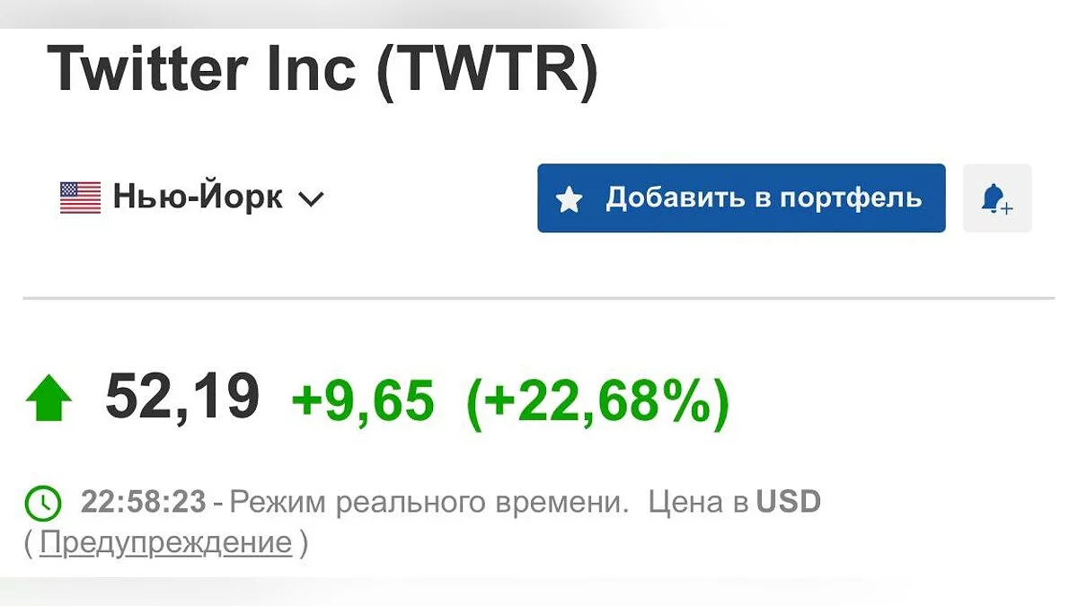 Однако теперь ситуация снова вернулась на уровень готовности к сделке. Предполагается, что окончательное решение могут принять уже на этой неделе. На фоне этой информации стоимость акций Twitter выросла перед закрытием торгов.