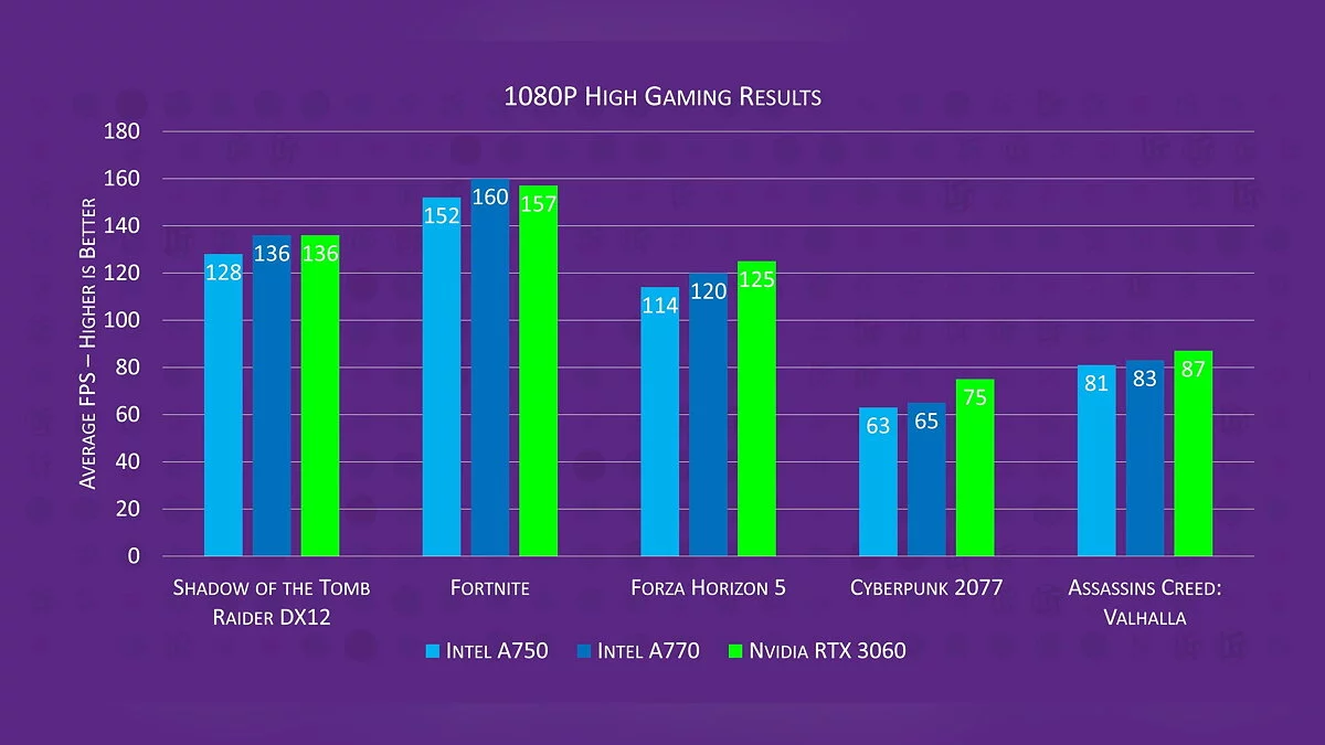 Как оказалось, в современных играх решения Intel находятся вполне на уровне NVIDIA RTX 3060 и AMD RX 6600. Это касается, к примеру, God of War, Assassin's Creed Valhalla и Cyberpunk 2077, которые построены на современных графических API, вроде DirectX 12 или Vulkan. Ранее Intel даже утверждала, что её карты превосходят RTX 3060 в режиме трассировки лучей.