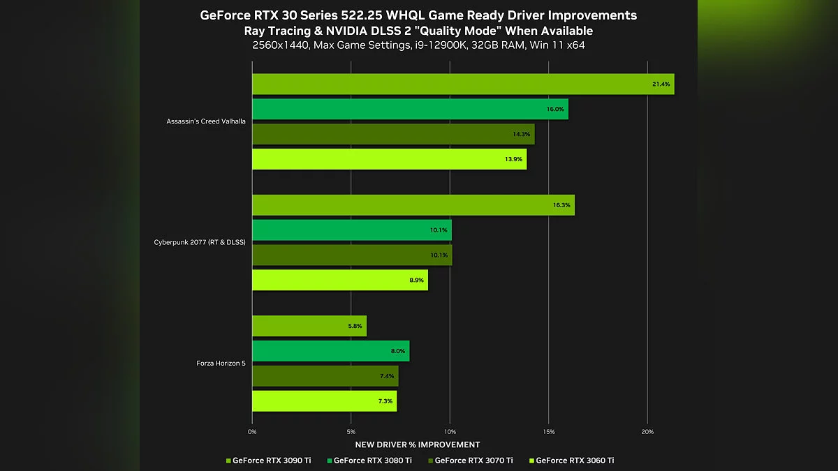 Отмечается, что показатели выросли на 5–24% без использования технологии сглаживания DLSS. Больше всего показатели увеличились в Assassin's Creed Valhalla на те самые 24%.