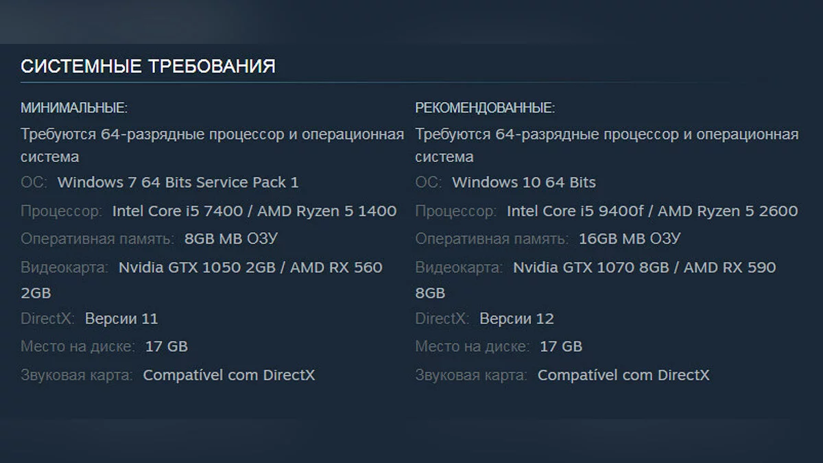 В Steam уже появилась страница экшена, где можно найти скриншоты и системные требования. Для запуска игры потребуются как минимум Windows 7, 8 ГБ оперативной памяти, видеокарта GTX 1050 и 17 ГБ свободного места.