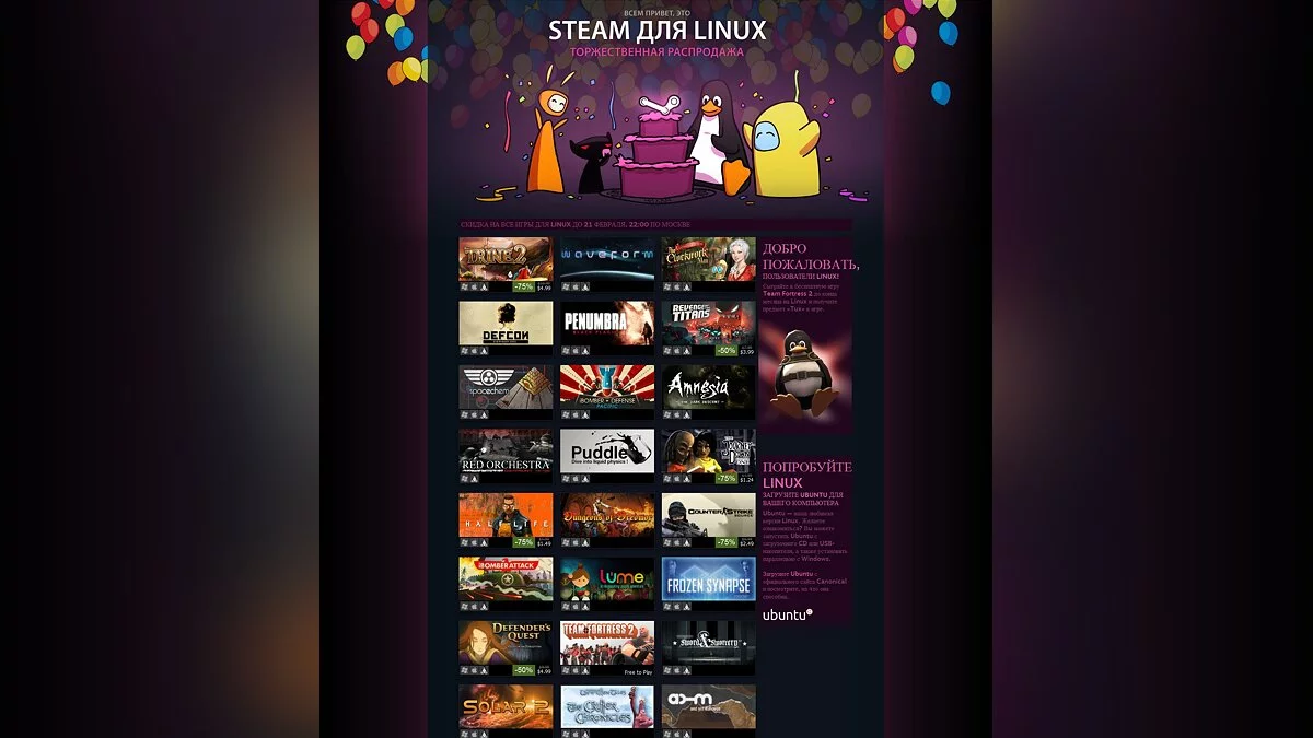 Компания Valve не без гордости объявляет о доступности официального клиента Steam под ОС Linux Ubuntu. По этому случаю компания собрала 50 игр, которые уже сейчас без особых сложностей можно запустить на Linux Ubuntu, причем продаются они со скидкой 50-75 %!