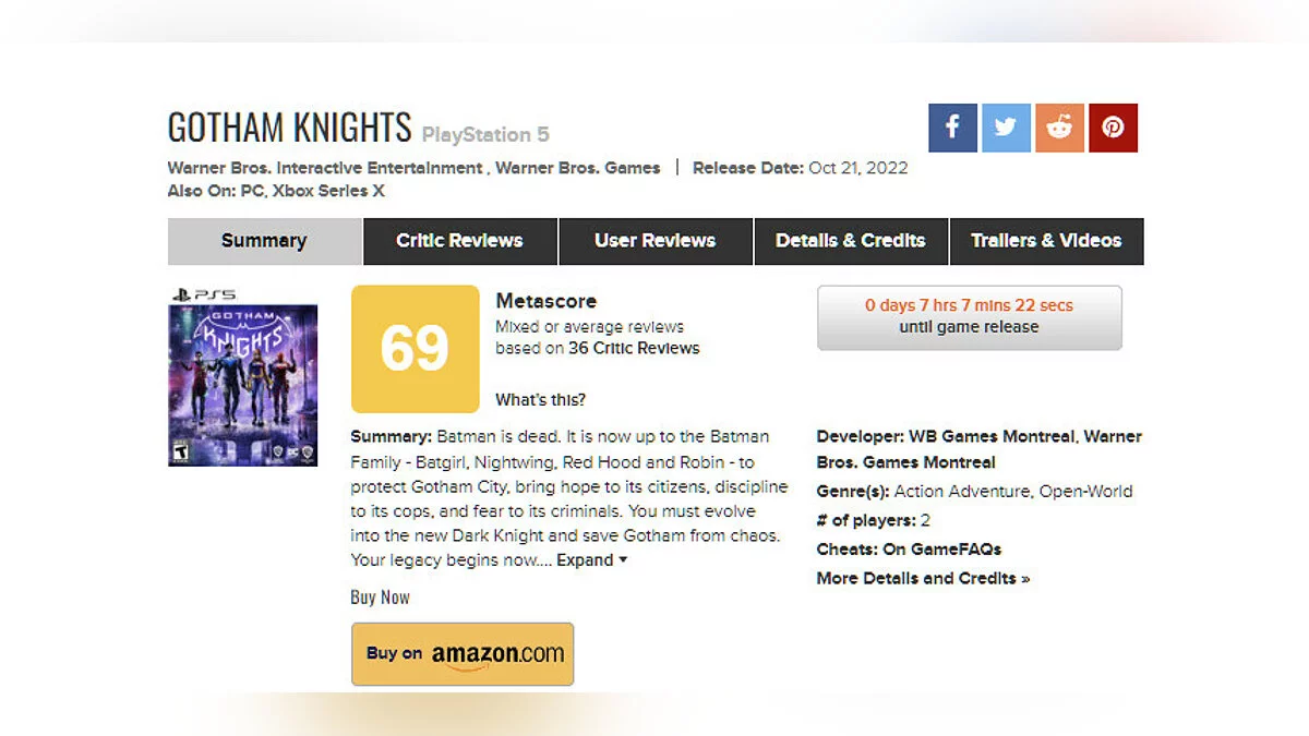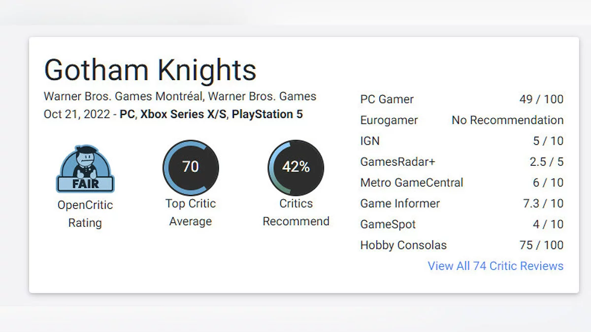 В сети появились первые обзоры Gotham Knights — кооперативного экшена про бывших напарников Бэтмена. На Metacritic у игры 69 баллов, на OpenCritic — 70 баллов и меньше половины рекомендаций к покупке.