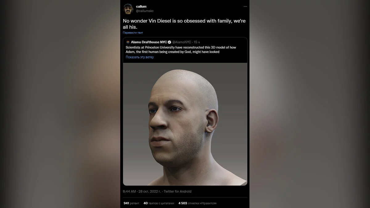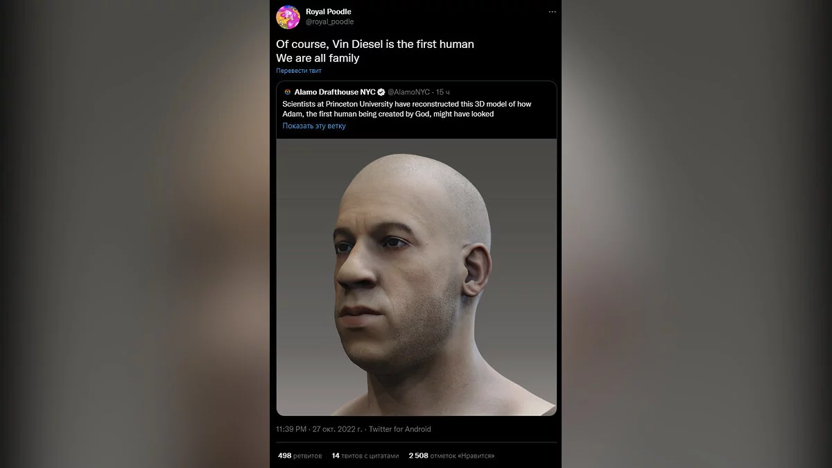 Креационисты, возрадуйтесь! Оказывается, Вин Дизель (Vin Diesel) стоит не только за франшизой «Форсаж», но и у истоков всего человечества. По крайней мере, так заявил Twitter-аккаунт американского кинотеатра Alamo Drafthouse NYC. Его ведущие в шутку заявили, что некие ученые из Принстона смогли воссоздать внешность первого человека Адама, и он сильно напоминает одного голливудского актера.