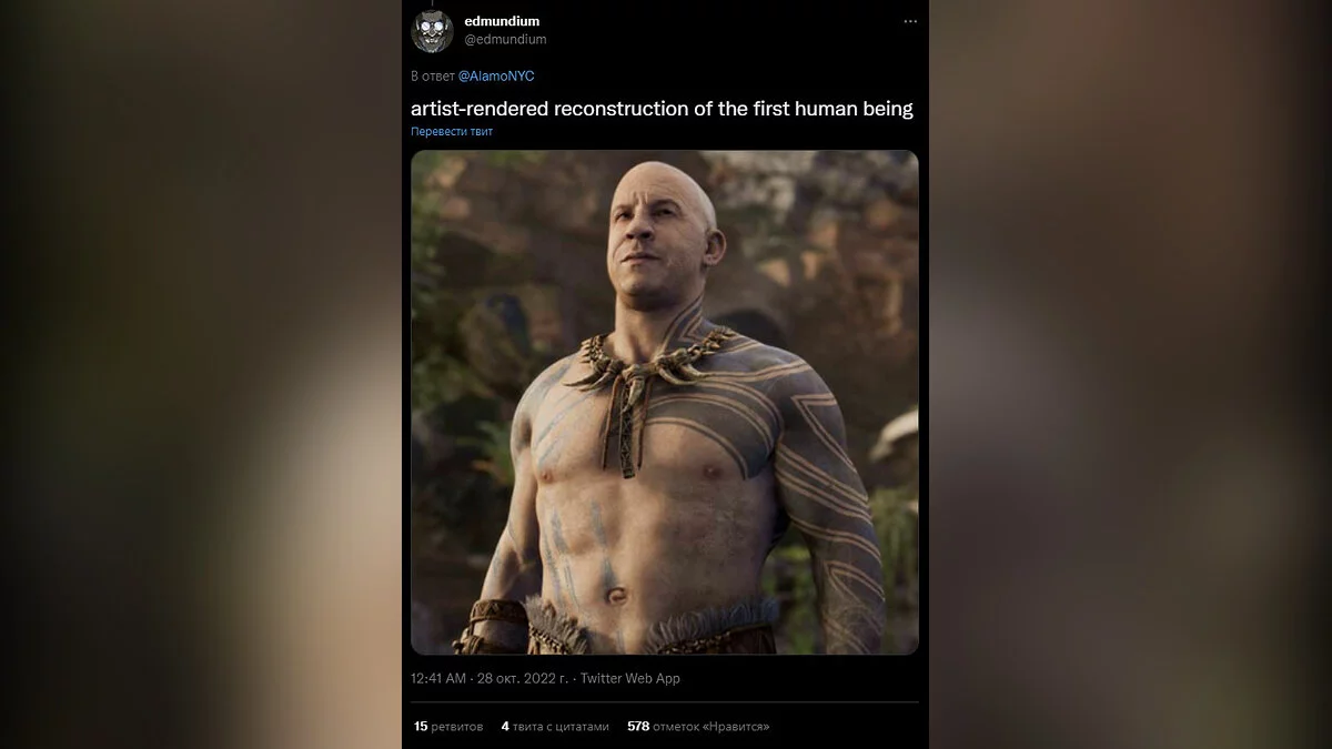 Вин Дизель стал героем нового мема. Звезду «Форсажа» превратили в первого человека Адама, и шутки про семью стали еще смешнее