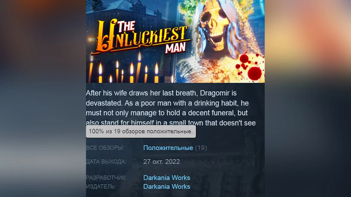 The Unluckiest Man — мрачное трагикомическое приключение. Главным героев выступает Драгомир, вдовец, который недавно потерял жену. Игроки смогут исследовать полуразрушенный дом персонажа и часть рыбацкого городка в режиме от первого лица. Чтобы продвигаться по сюжету, придётся искать ключи, собирать предметы и решать легкие головоломки. Во время прохождения можно читать газеты с городскими сплетнями и разбросанные заметки о прошлом героя. Ещё можно беседовать с горожанами. Страница в Steam.