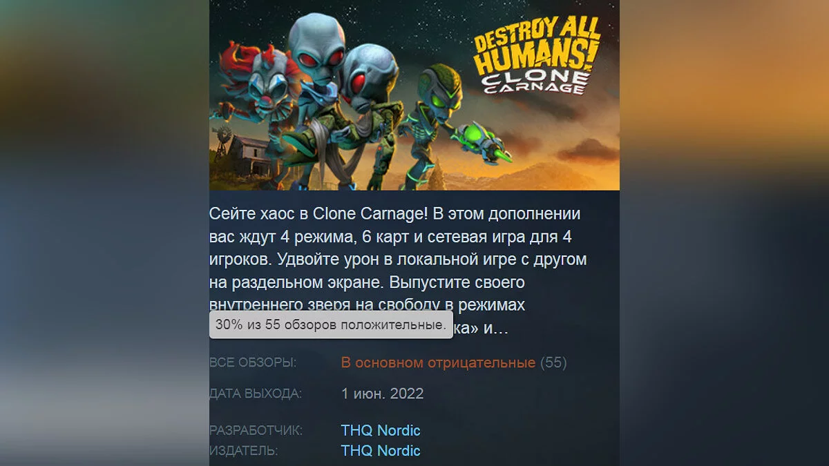 В Steam навсегда бесплатным стал мультиплеерный спин-офф ремейка Destroy All Humans! с подзаголовком Clone Carnage. Ранее он продавался за 659 рублей.