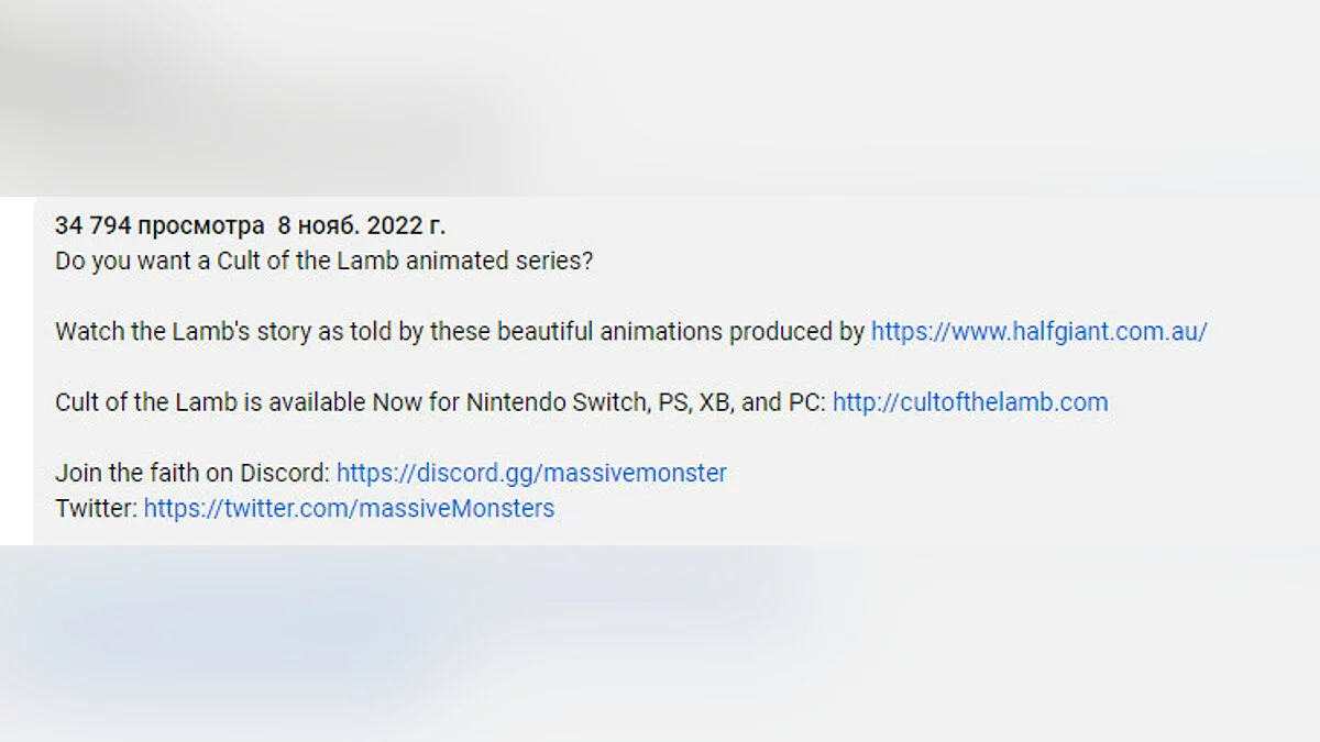 Помимо этого, в Twitter-аккаунте игры авторы написали, что некоторые из геймеров хотели бы увидеть полноценный мультсериал по мотивам Cult of the Lamb. А в описании к короткометражке этот же вопрос задают напрямую: «Хотите ли вы увидеть мультсериал Cult of the Lamb?».